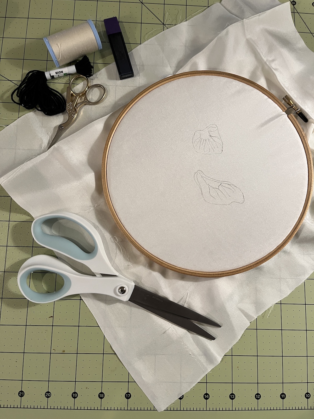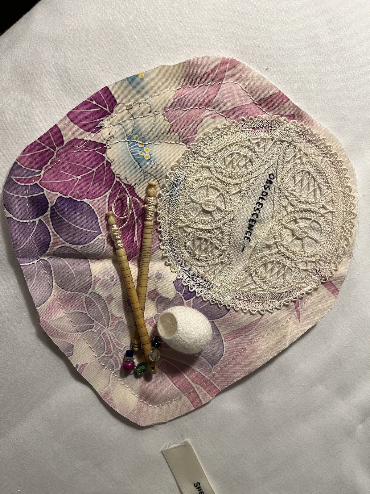 In the essay, I draw conceptual inspiration from Derrida, Cixous and Robertson’s works, which are all recast as fragmentary quotes that wander across the space of the hoops and pocket artifacts. The essay explicitly engages with textile work as a form of suspended making-and-waiting, referencing Derrida's concept of s’avoir (self-possession) and Robertson’s figure of the post-reproductive she-dandy to explore themes of autonomy and obsolescence during the process of insect-becoming. By utilizing reclaimed silk kimono linings as its primary material, Imaginal Pockets also interrogates questions of destruction and recreation in both biological and artistic processes.