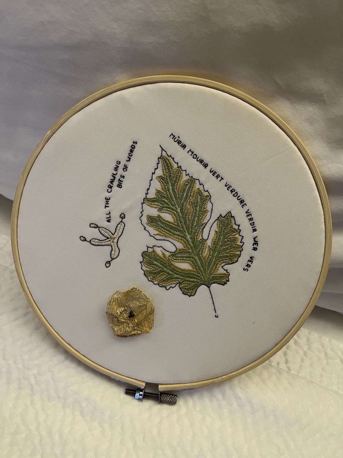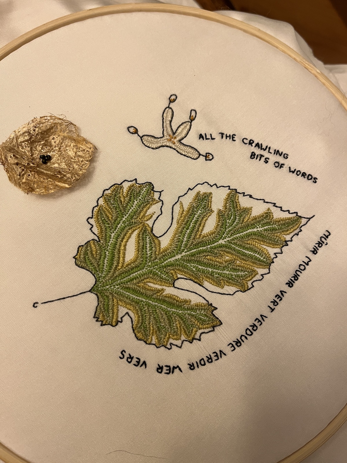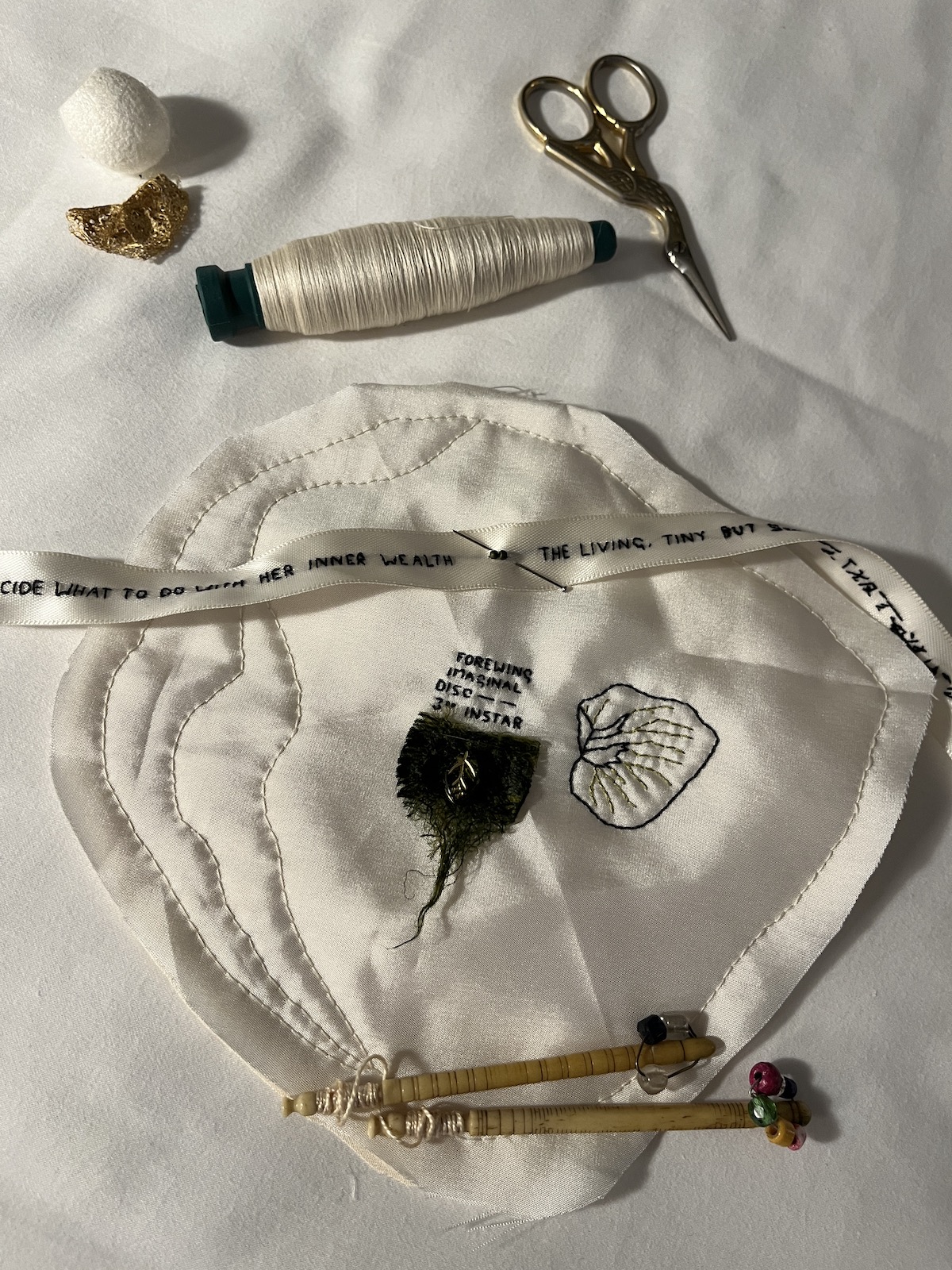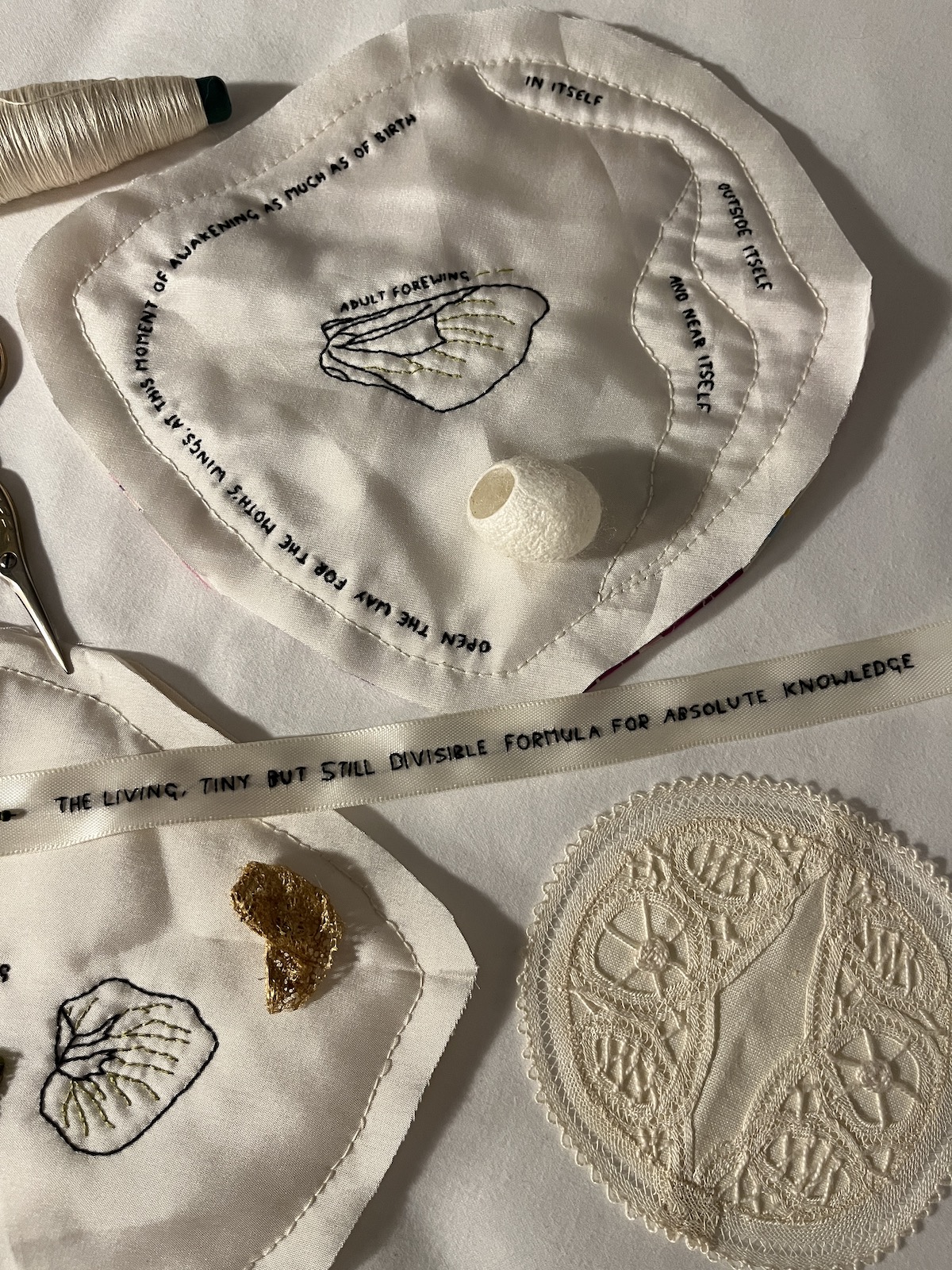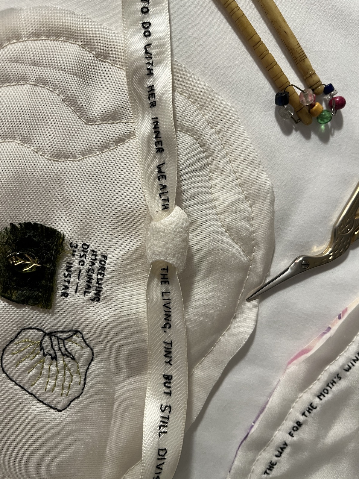 Imaginal Pockets is a textile installation that consists of four embroidered hoops, a silk pouch, and two padded silk artifacts, embroidered on one side with scientific illustrations of insect body parts and mulberry leaves, and with lace “pockets” attached on the obverse containing silk thread, lacemaking bobbins and other materials. Each is embellished with ribbons embroidered with quotes from Jacques Derrida’s “A silkworm of one’s own,” Hélène Cixous’ Veils and Lisa Robertson’s Proverbs of a She-Dandy.