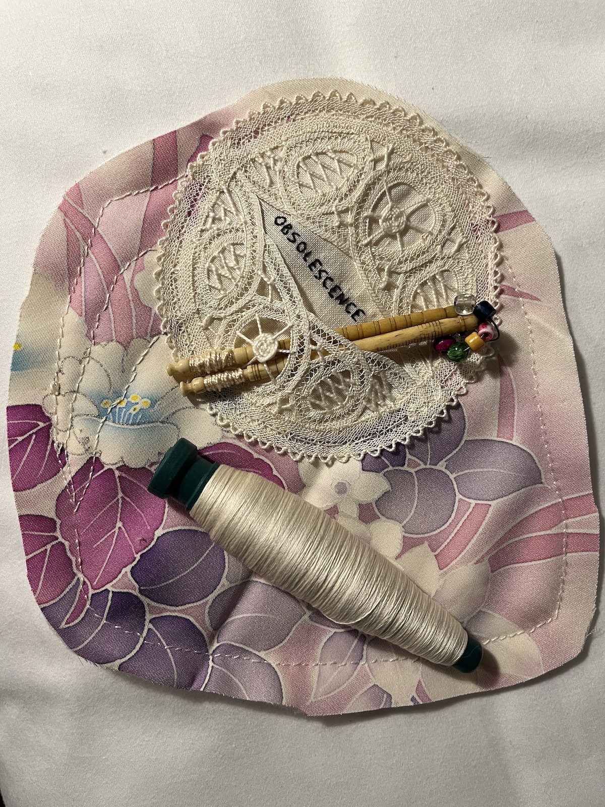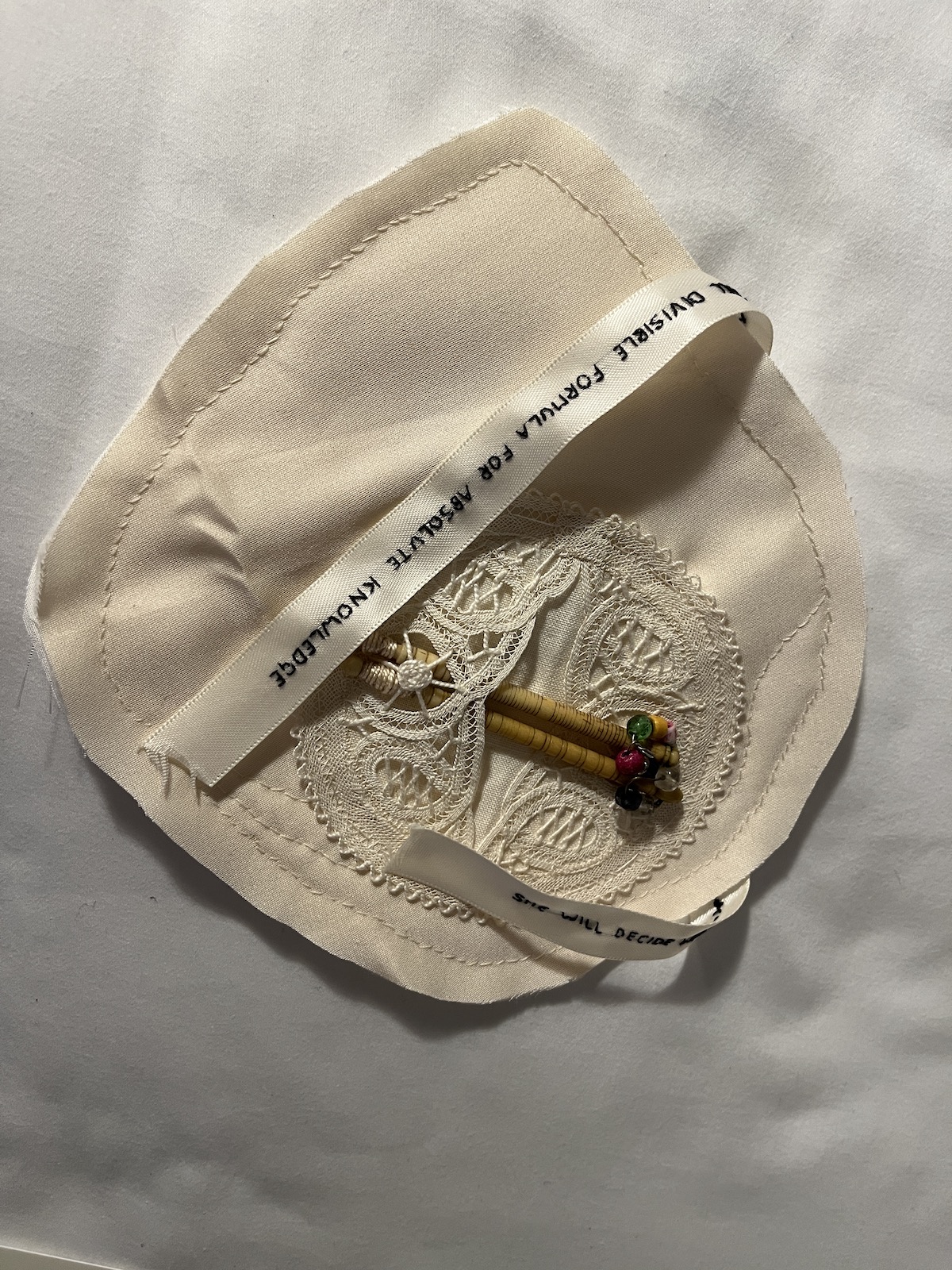 Materials: deconstructed silk kimono lining, silk & cotton thread, silk carrier rod "paper," linen Belgian lace, cotton quilt batting, satin ribbon. Usually also features bone lace bobbins and mulberry cocoons as pictured, but I accidentally left them at home. The two free-lying pockets feature the imaginal forewing and adult forewing of the silk moth. On the adult wing pocket, Derrida's full quote is "open the way for the moth's wings, at this moment of awakening as much as of birth .. the return to itself of the silkworm which lets fall its old body like a bark with holes in it" - On the latter, a ribbon is pinned embroidered with two quotes enjambed from Derrida and Lisa Robinson: "the living, tiny but still divisible formula of absolute knowledge" and "she will decide what to do with her inner wealth."