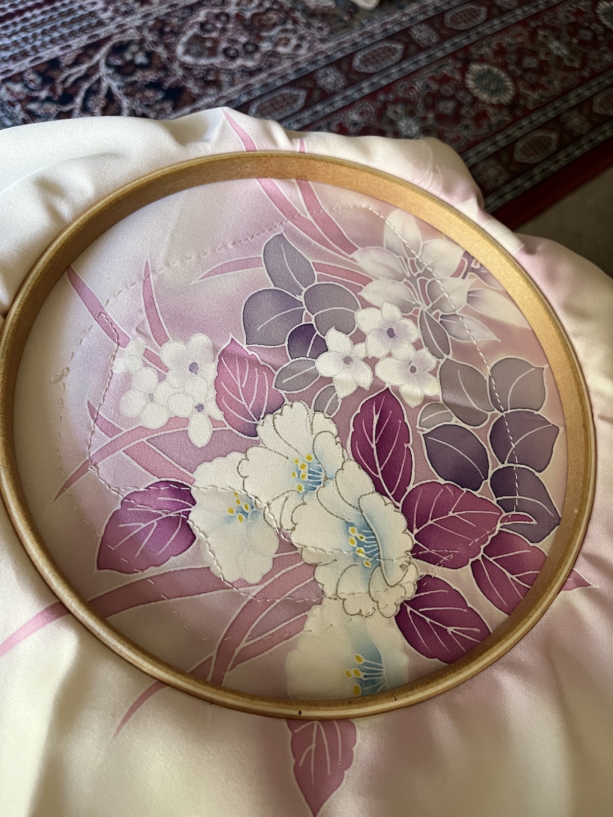 My needle stabs the silk, drawing thread taut. I cut with cruel scissors, large and tiny. Silk itself is commonly produced by baking or boiling pupae in their cocoons so that they don’t damage the thread on emergence. On receiving my reclaimed silk linings, which were still in full kimono form, the first thing I did was tear them apart, ripping at the seams. I am taking apart one form to produce a new one, and doing it enthusiastically, with hopes for the future, but also regret for the lost skills that went into building these silk linings. Like imaginal discs, linings are unseen, except for momentary glimpses as a sleeve falls into view. And yet their beauty is hidden there in the careful selection of patterned fabric that will only be apprehended by maker and wearer. Linings are intimate, like the discs that produce the worm that produces the silk, in a closed loop.