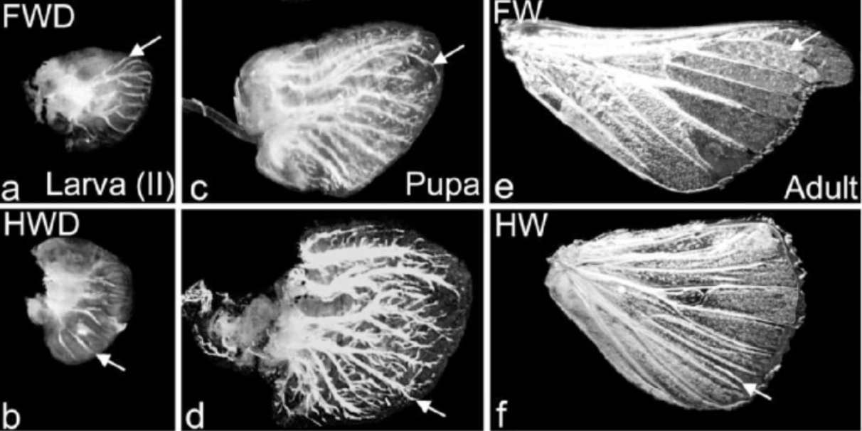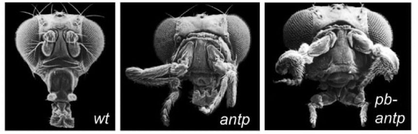 Manipulation of this becoming can lead to unexpected results. Hox genes, for example, determine ordering along the head/tail axis of the insect; a mutation in the antennapedia Hox gene Antp, will cause drosophila antennae and leg discs to scramble their positional instructions, leading to an ectopic pair of legs growing out where antennae should be. Conversely in silkworms, antennapedia mutation leads to “a transformation of the prothoracic legs into antennae … and a severe growth suppression of the silk glands” (Nagata 555). Mutation of the intersex (ix) gene with CRISPR/Cas-9 techniques causes sterility and mutation of external genitalia in female (but not male) adult silk moths, along with imaginal disc malformations of wing, antenna and leg, while bombyxin, an insect insulin peptide analog first discovered in silkworms, acts as an experimentally controllable growth factor for wing imaginal discs (Mizoguchi).
