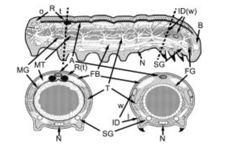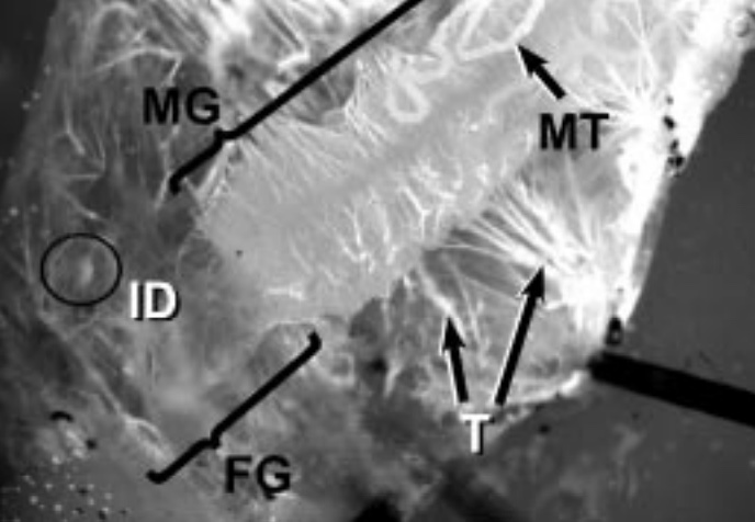 Imaginal discs are tiny. Really, really tiny. Dwight E. Lynn notes that “Their name derives from the Latin “imago” in the sense that these structures are the likeness of the adult in the larvae, but they can be so difficult to find that one might think the term derives from “imaginary.”” (143) Here’s an image, for example, of a wing disc in a Manduca sexta (tobacco hornworm) larva – the white shadow labelled ID. The cross section diagram shows fore and hindwing locations, positioned on each side of the larva near the front of the creature. (Lynn 143)