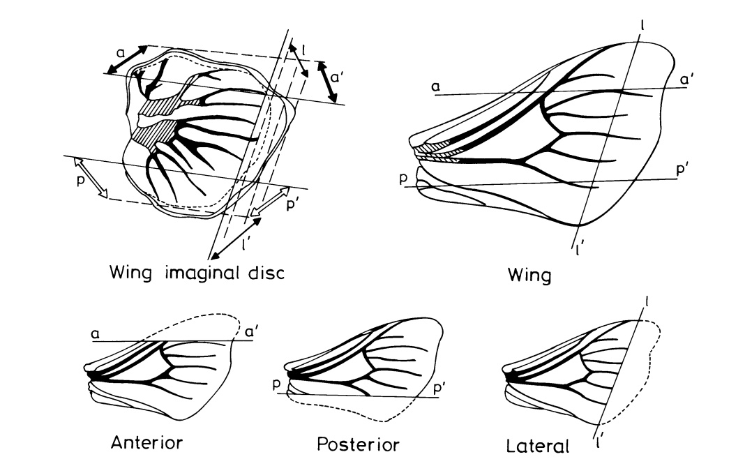 The language of scientific papers describing silkworms fascinates me. In addition to Lynn’s “destined to become,” the quickest of scans reveals such evocative phrases as “precocious metamorphosis” (Daimon et.al, E4226), and “fate map” (Kyoda 79). Developmental Cell journal, in an article highlight, describes the development of a drosophila wing disc as “like an origami crane forming from the folds of a paper” (i), while Lewis Held’s delightful book Imaginal Discs: The Genetic and Cellular Logic of Pattern Formation includes such language as “Models, Mysteries, Devices, and Epiphanies,” and cites Aristotle and Homer. And of course my favorite phrase, “Expression of Nubbin.” But interwoven with this language of life, becoming, precocity and growth is the tender underbelly of biological research. Lynne’s essay, consisting of detailed instructions for initiating new cell lines from lepidoptera, is affectively difficult to read, with its references to starving, immobilization, pinning and excision; what Madhuri Kango-Singh refers to elsewhere, euphemistically, as “perturbing.” Perturbation of imaginal tissue leads to highly specific developmental changes; for example this image shows how the excision of a portion of the wing imaginal disc leads to a corresponding absence of a portion of the wing once developed.