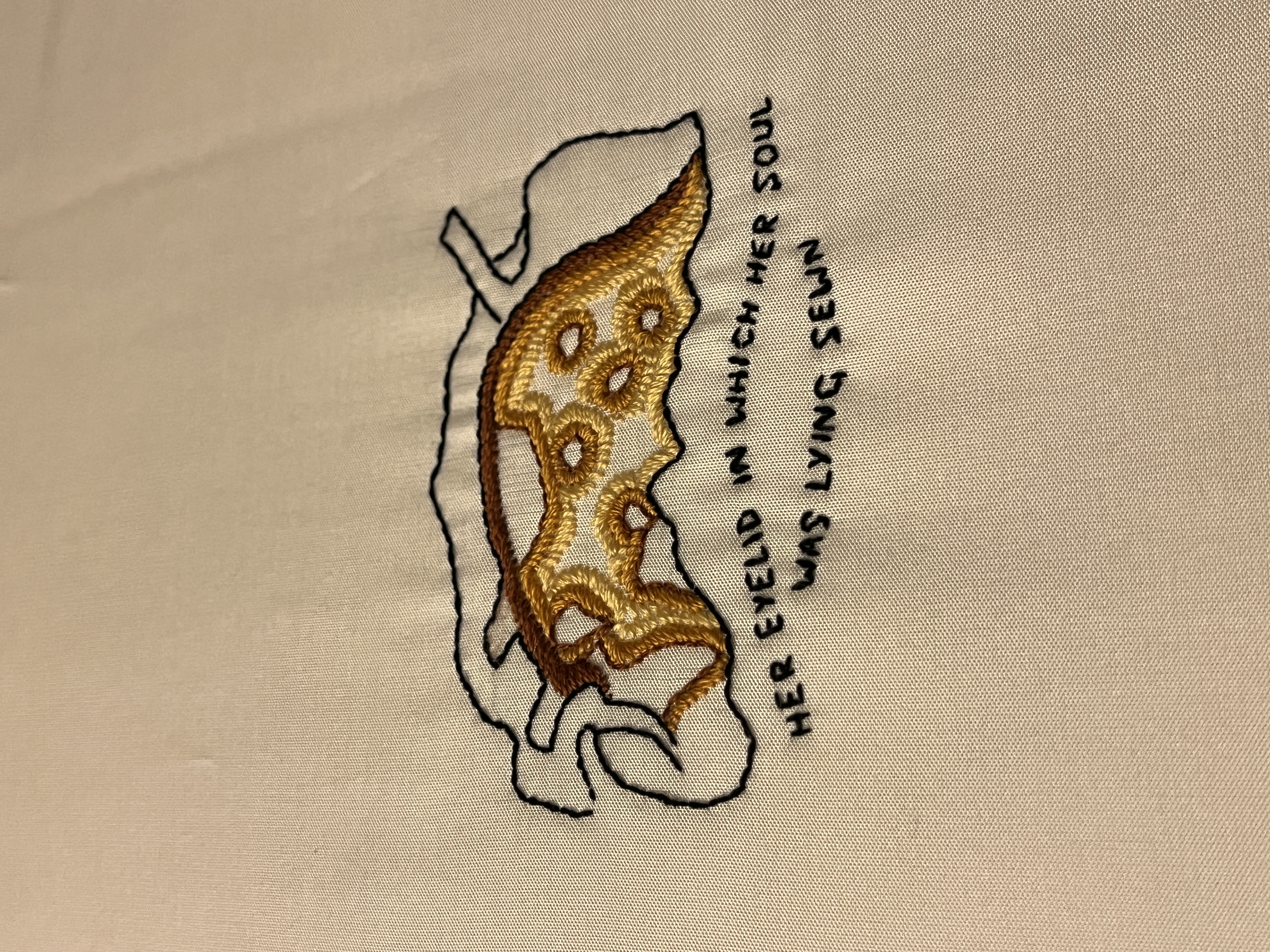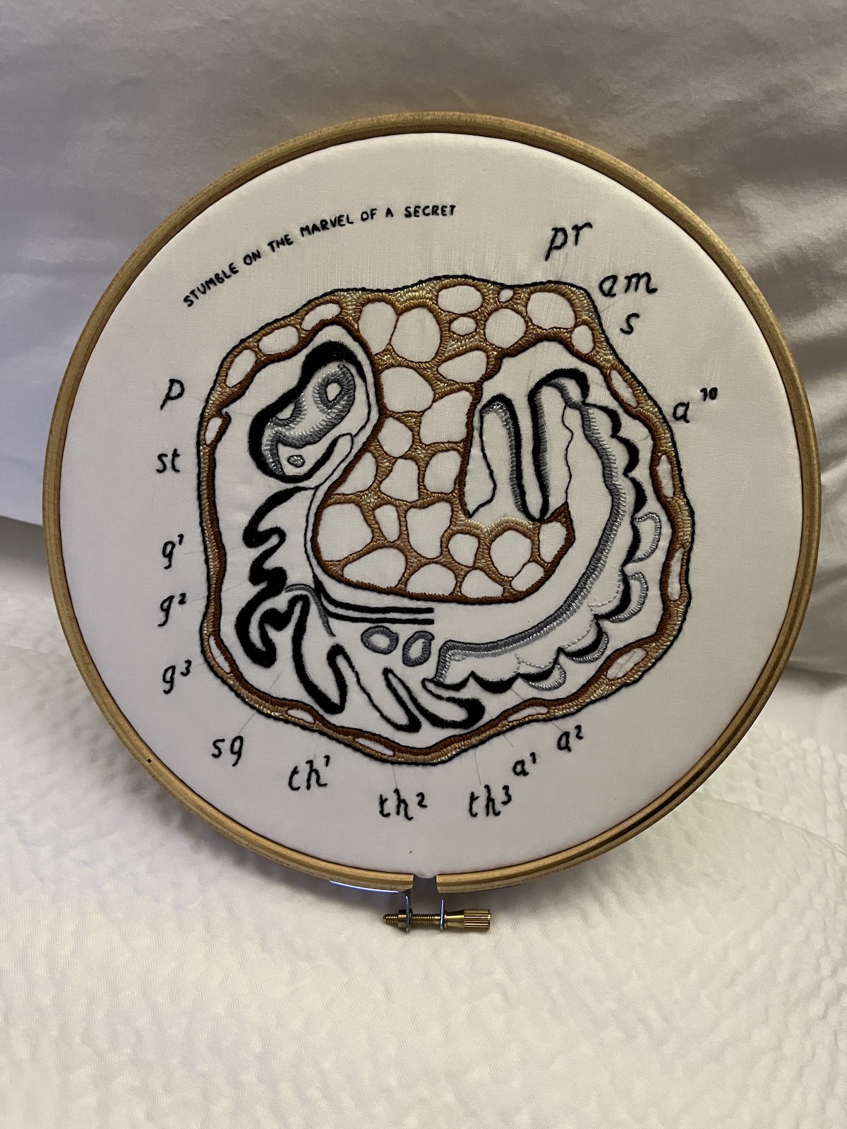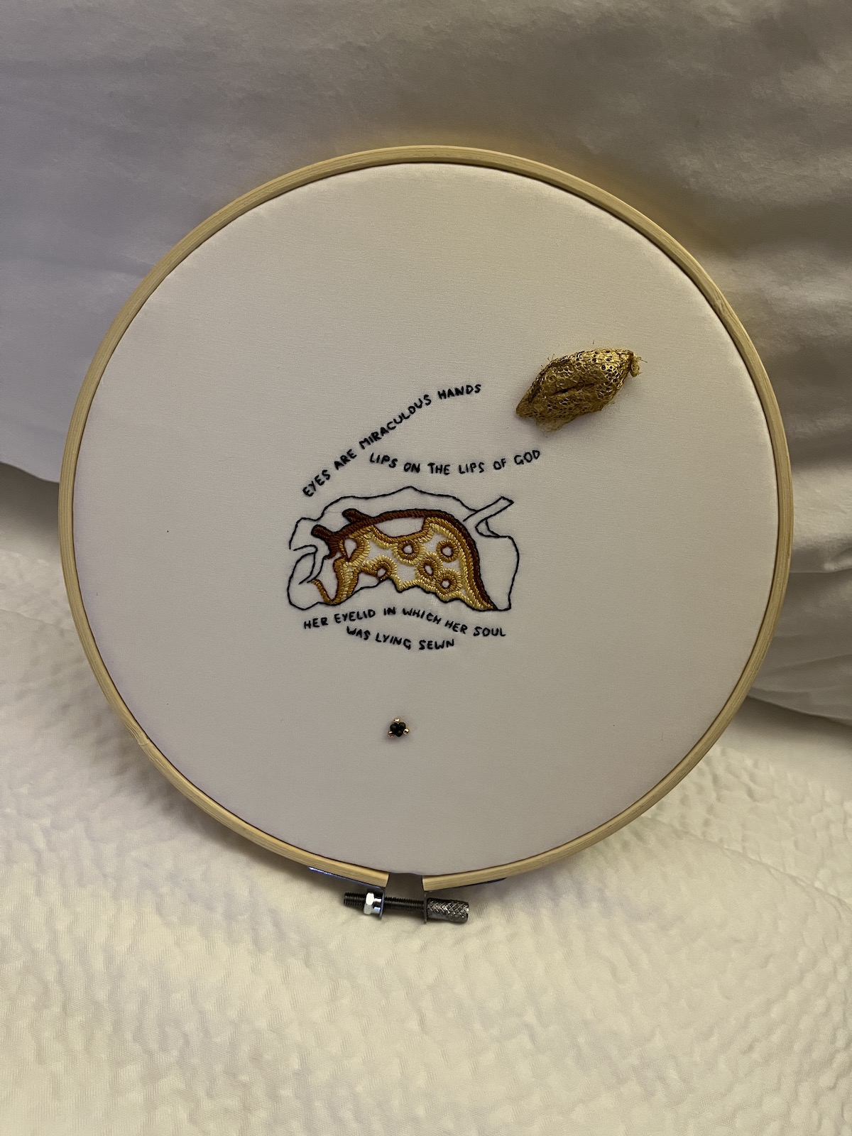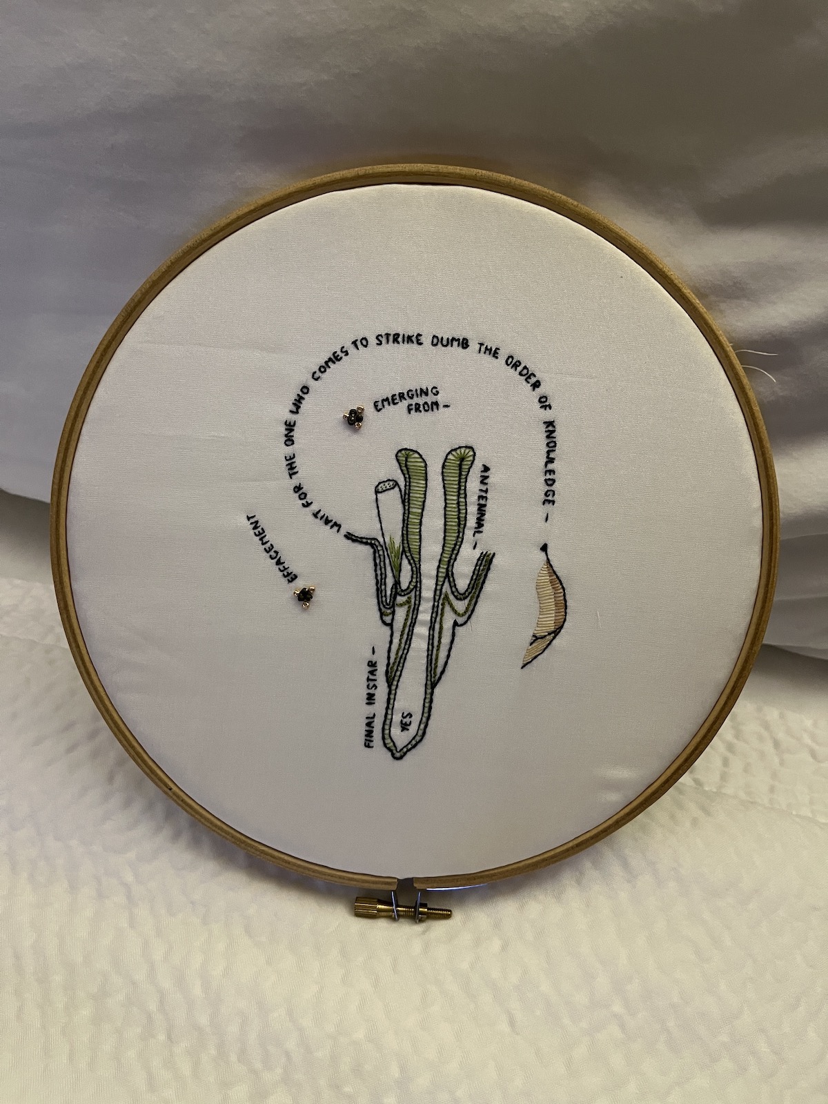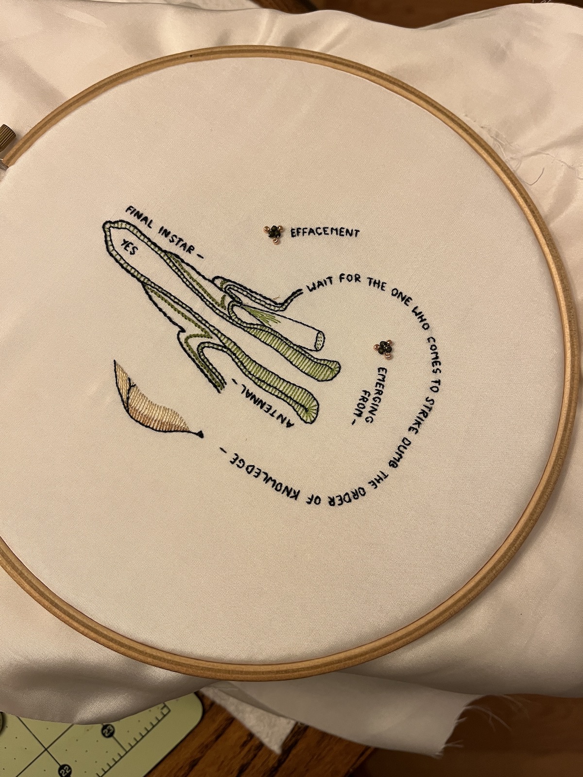 Materials: deconstructed silk kimono lining, silk & cotton thread, cricula cocoon, cotton quilt batting, glass beads. The eye disc is situated close to the antennal disc (in some insects, they are directly attached). The dark center thread in the image is the disc. This hoop includes quotes from Cixous, and a cricula silkmoth cocoon, a metallic-looking gold cocoon spun by a moth native to South Asia. Cricula silk fabrics are not well known, but the natural gold color produces particularly beautiful textiles.