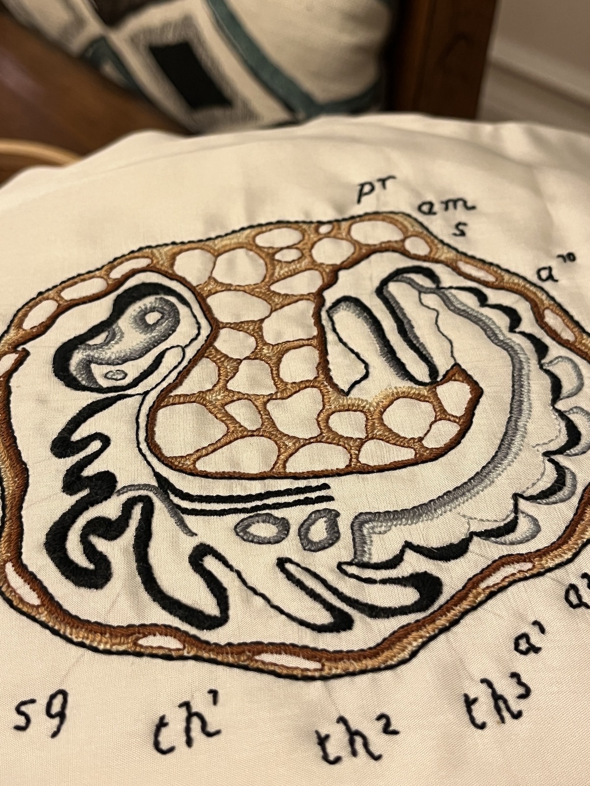 Materials: deconstructed silk kimono lining, silk & cotton thread, cotton quilt batting. This diagram of a moth-in-embryo comes from The Cambridge Natural History, c.1899, in an image captioned "Embryo of a Moth (Zygaenea) on the fifth day (after Graeber)." The letters circling the embryo label the individual parts of the embryo. I've stitched the key to these parts onto a ribbon for reference. The quote is from Derrida (full line: "stumble on the secret of a marvel, the secret of this secret over there, at the infinite distance of the animal, of this little innocent member, so foreign yet so close in its incalculable distance").
